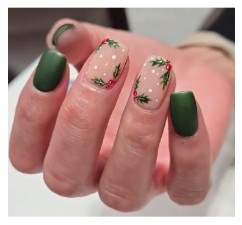 Festive Christmas-themed manicure with green and beige nails, featuring holly designs and red berries.
