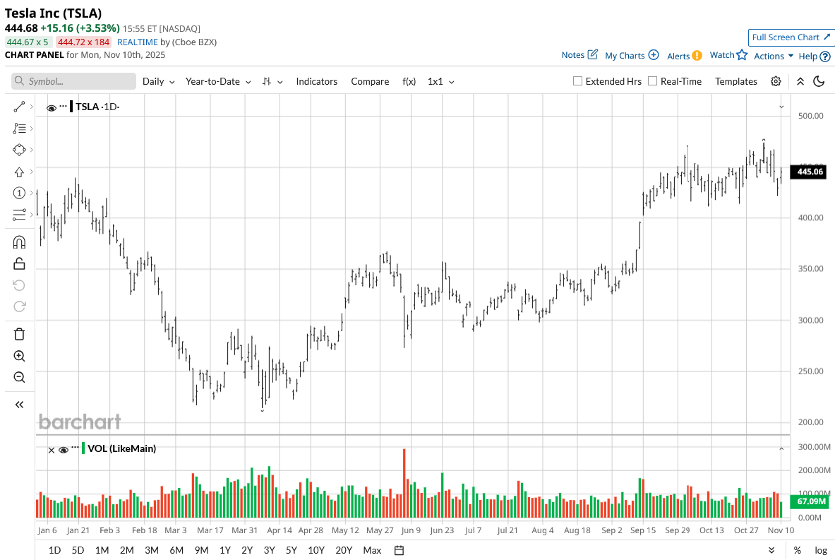In the past year, Tesla’s shares have ranged from $214.25 to $488.54. Although Tesla’s stock is up over 105% from its 52-week low, there has been downward pressure since mid-October due to lower margins. TSLA stock's movement appears to demonstrate market excitement yet volatility stemming from Musk’s choices, compared to the 22% year-to-date (YTD) rise in the Nasdaq Composite ($NASX).