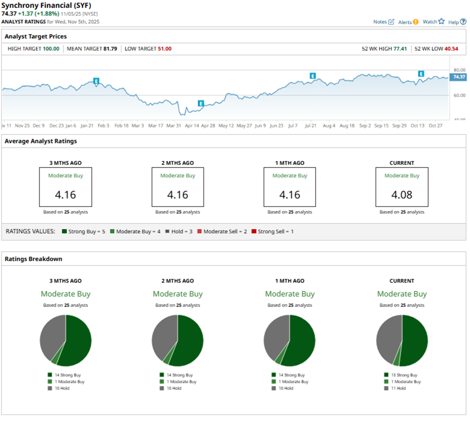The mean price target of $81.79 represents a premium of nearly 10% to SYF's current levels. The Street-high price target of $100 implies a potential upside of 34.5% from the current price levels.