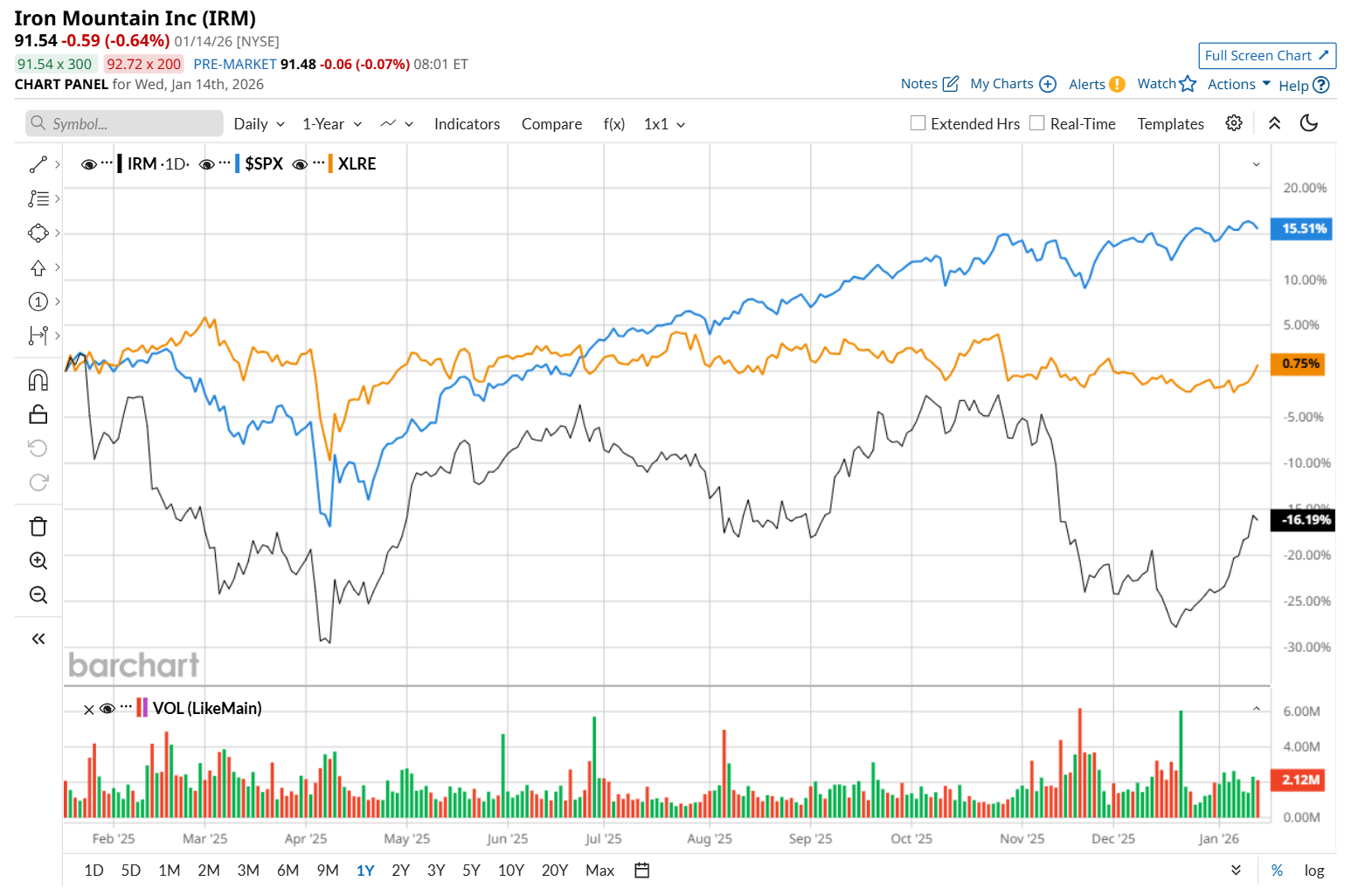 IRM has declined 12% over the past 52 weeks, considerably lagging behind both the S&P 500 Index's ($SPX) 18.6% return and the State Street Real Estate Select Sector SPDR ETF’s (XLRE) 3.4% uptick over the same time period.