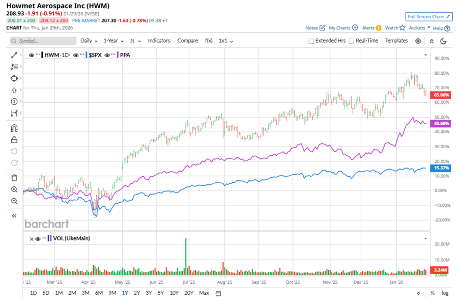Zooming in further, HWM’s outperformance is also apparent compared to Invesco Aerospace & Defense ETF (PPA). The exchange-traded fund has gained about 48.1% over the past year. However, the ETF’s 12.2% returns on a YTD basis outshine the stock’s single-digit gains over the same time frame.