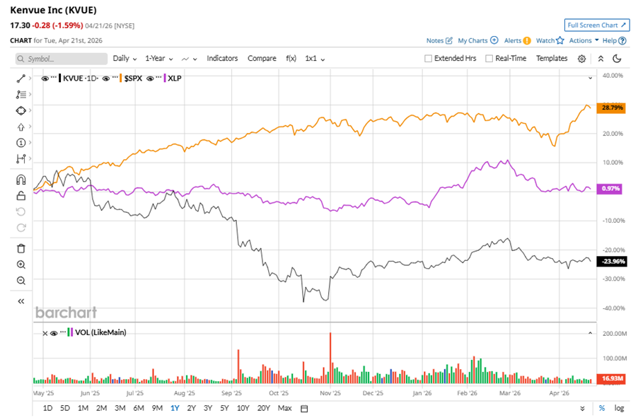 KVUE stock has underperformed the S&P 500 Index’s ($SPX) 33.6% gains over the past 52 weeks, with shares down 22.3% during this period. Similarly, it underperformed the State Street Consumer Staples Select Sector SPDR ETF’s (XLP) marginal returns over the same time frame.