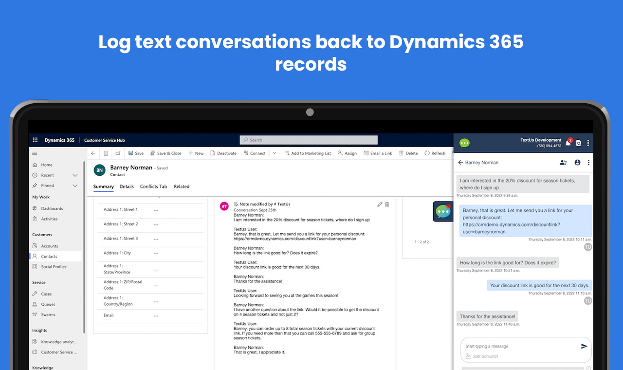 - Conversational Texting. Increase prospect and customer engagement by adding two-way texting to Microsoft Dynamics, and use built-in quick text features for a fully integrated experience.