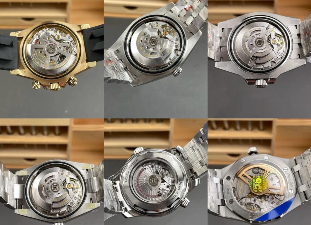 Commonly discussed movement directions include clone-style Rolex calibers, integrated automatic structures associated with certain Omega-focused replicas, and decorated mechanical movements designed to visually resemble Swiss architecture.