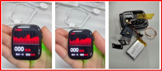 Teardown images of a Huaqiangbei Shanzhai smartwatch: identical exterior, substandard internals
