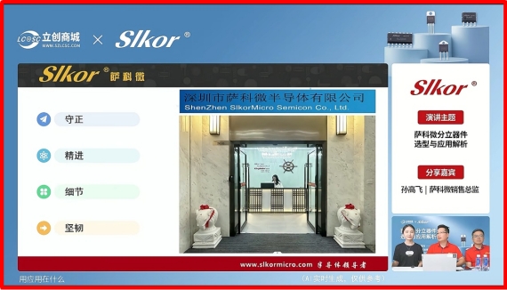 In August 2025, the first live stream event co-created by Slkor and LCSC was a complete success. The entire live stream attracted over ten thousand online participants. Focusing on the practical application of products, it showcased the performance characteristics and usage scenarios of Slkor's product series, from semiconductor power devices to power management chips, through easy-to-understand explanations and introductions. This gave users a more intuitive and in-depth understanding of Slkor's product models and technical advantages.