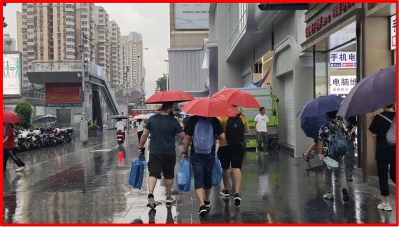 Slkor red umbrellas on a rainy Huaqiangbei street