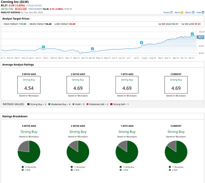 Strong market sentiments for advanced materials and tech-centric manufacturing have kept Corning’s stock on an upward trend. Over the past 52 weeks, the stock has gained 81.2%, while it is up 86.2% over the past six months. Following its Q3 earnings release on Oct. 28, Corning’s shares reached a 52-week high of $92.57 on Oct. 31, but have since declined about 8% from that level.