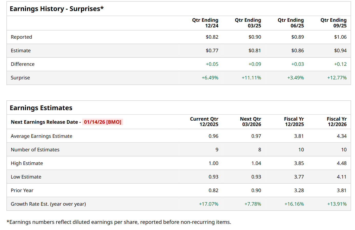 Valued at a market cap of $396.2 billion, Bank of America Corporation (BAC) is a global financial institution that provides a wide range of banking and financial services to individuals, businesses, and institutional clients. It is expected to announce its fiscal Q4 earnings for 2025 before the market opens on Wednesday, Jan. 14.