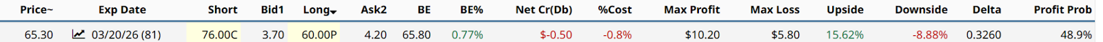 That’s not a cop out, it’s a case for managing risk, while trying to hang in there with SLV. In fact, in that SLV article from Dec. 19, I included this collar possibility. $76 cap, $60 floor, 20% upside, 6% downside and cost (rounded), and a 3/20/2026 expiration date.