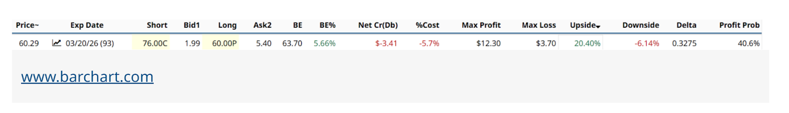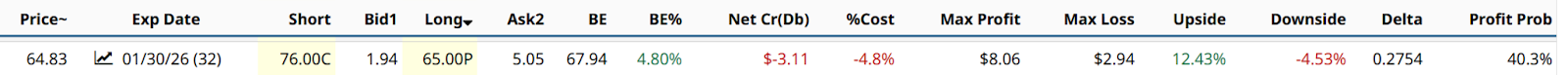 In this collar example, one of many we can filter and run on Barchart.com to survey the playing field in depth, that same upside limit (which would be an all-time high) could be had versus a tightened up downside limit of $65, and for a shorter period of time (late January 2026).