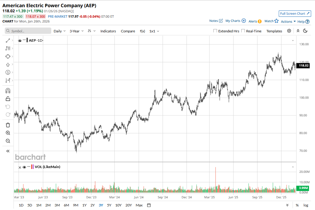 While previously AEP forecast annual earnings growth of 6% and 8% between 2026 and 2030, it has raised the guidance to between 7% and 9%. For 2026, it guided for an earnings per share (EPS) between $6.15 and $6.45, which is around 8% higher than the 2025 guidance.