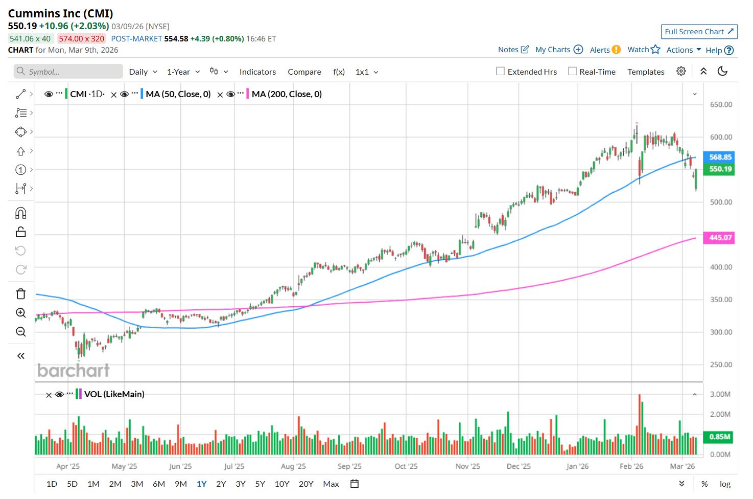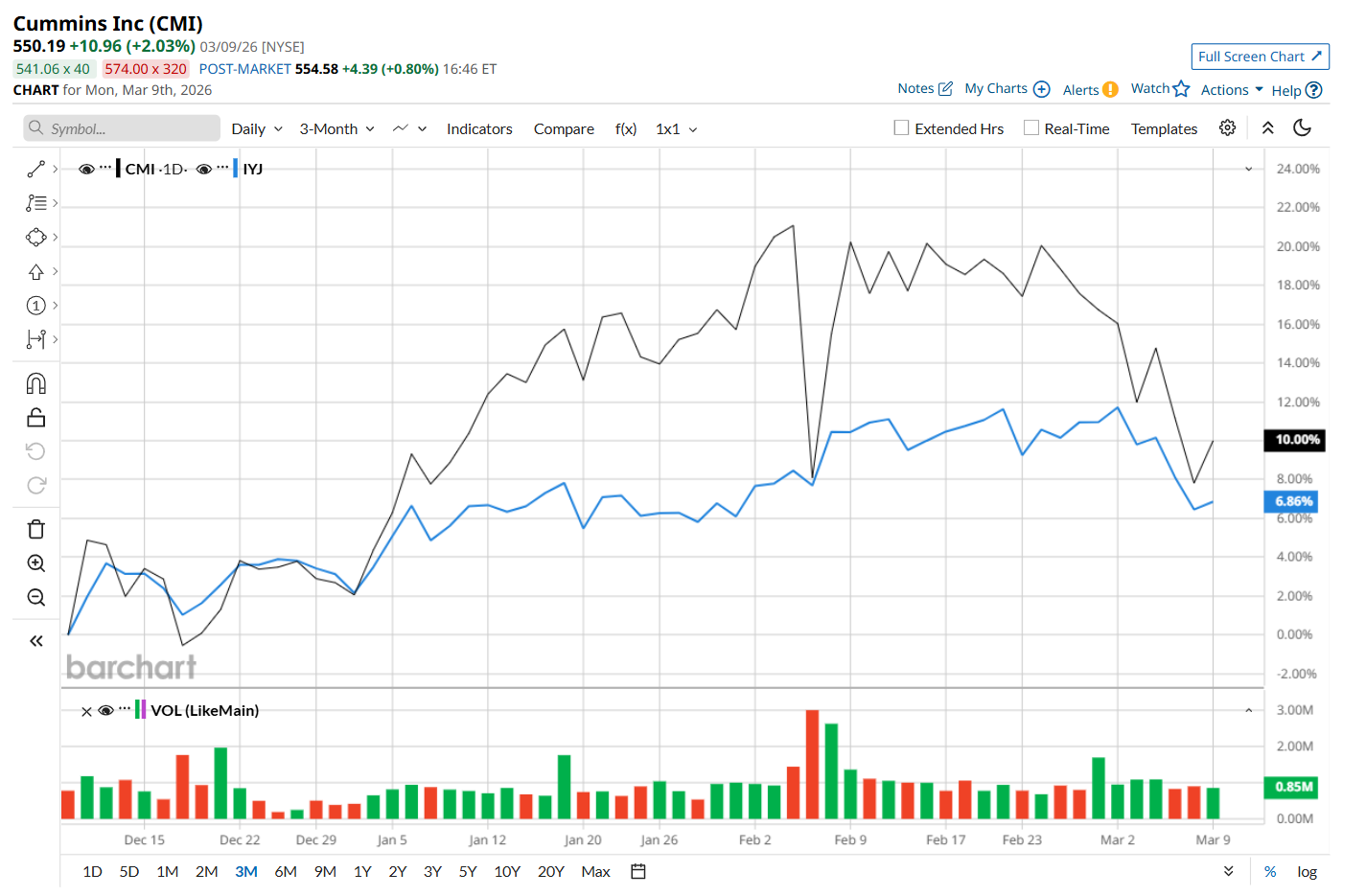 This industrial company is currently trading 11% below its 52-week high of $617.98, reached on Feb. 4. Shares of CMI have rallied 10% over the past three months, outperforming the iShares U.S. Industrials ETF’s (IYJ6.9% rise during the same time frame.