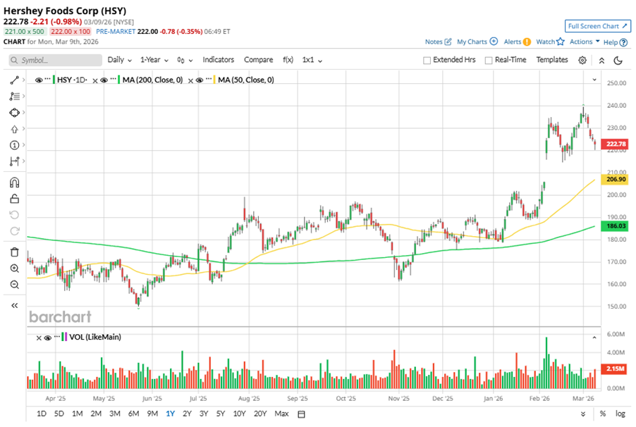 To confirm the bullish trend, HSY has been trading above its 50-day moving average since mid-December, 2025, with slight fluctuations. The stock is trading above its 200-day moving average since mid-July, 2025, with slight fluctuations.