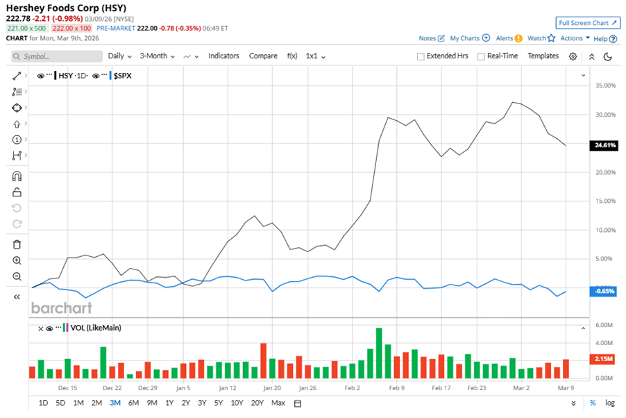Despite its notable strength, HSY slipped 7% from its 52-week high of $239.48, achieved on Mar. 2. Over the past three months, HSY stock gained 24.6%, outperforming the S&P 500 Index’s ($SPX) marginal decline during the same time frame.