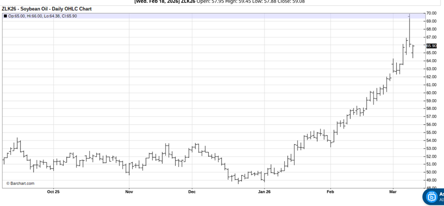 Fundamentally, the mammoth drop in crude oil (CBK26) (CLJ26) prices early this week is also bearish for bean oil. It’s likely that crude oil prices have put in a major top, which would very likely mean the same for bean oil.