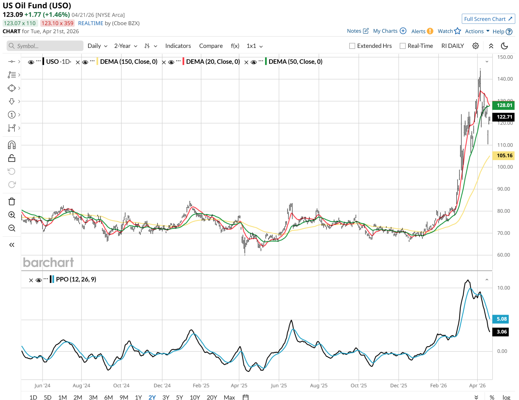 This chart shows a high and rolling over 20-day moving average, so it “should” drop. However, this is USO in April 2026. I don’t often say this, but throw the chart out. Because what is a better “bet” here is not the direction, but the volatility. It will probably be high again soon.