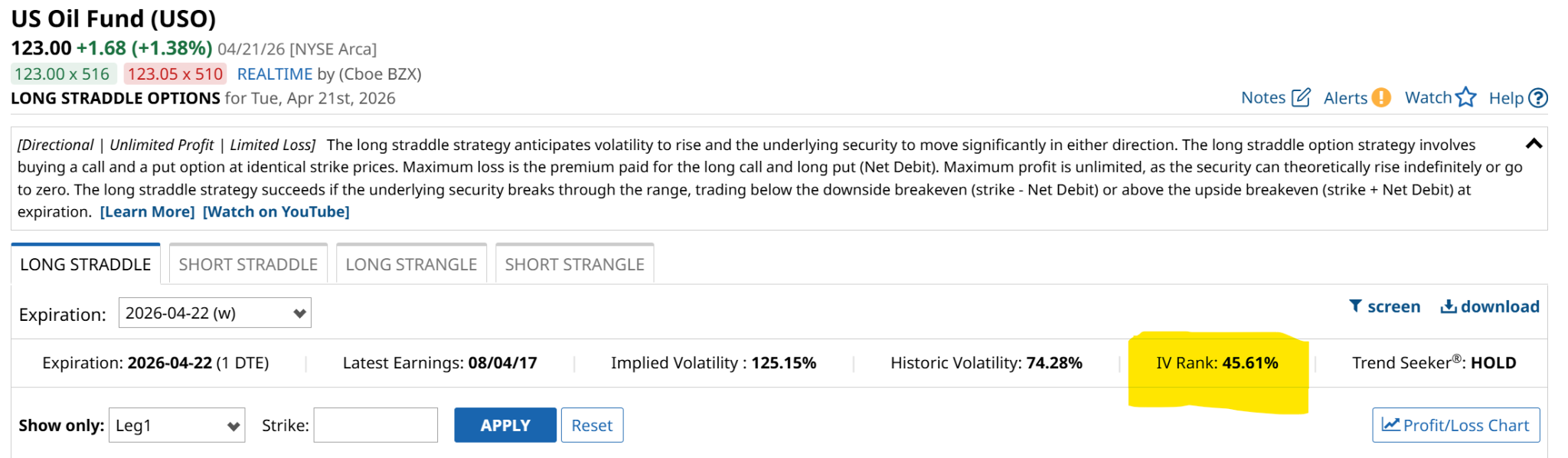 No, USO has not been a low-volatility ETF for a while. However, see that IV Rank in yellow above? It is around 45%. That’s very high for a stock or an ETF. But this is based on oil prices, after all. The key is that the IV rank near 50% and not at 100% indicates to me that this volatile ETF has moderated just enough recently, thanks to a pause in the Middle East hostilities.