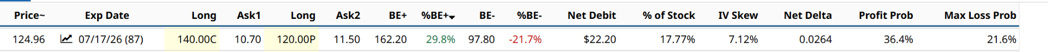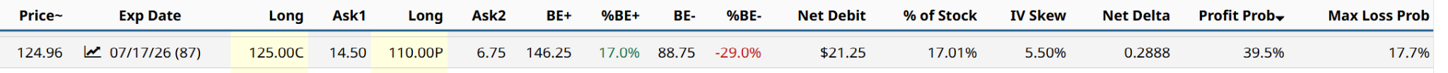 The strikes I chose were $125 for the call and $110 for the put. The cost of the options is still high, so the closer strike prices make up in part for the significant burden to put this on. The calls cost $14.50 (on 1 contact) and the puts cost $6.75, so that’s a $21.25 “bogie” to overcome.