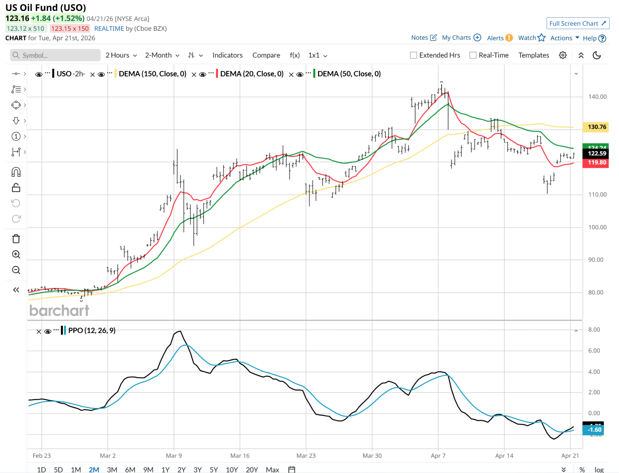 That brings me to a 2-hour chart that you see below, which is not something I show here often. But in the case of USO, it helps me define a potential near-term price range, based on where it’s been. At $122, I can see $140 as an upside price target, and about $108 on the downside. I’d call that “level one” in that it is relatively close to the current price.
