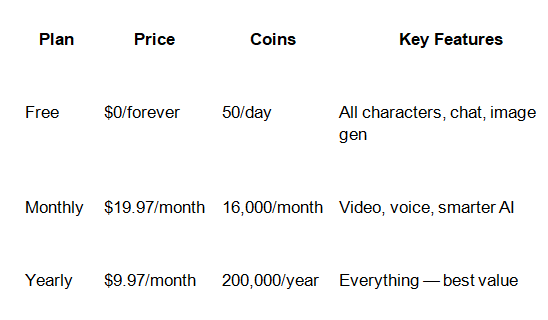 On Kalon.ai, the free tier includes image generation and character chat, which covers a meaningful portion of the adult experience. Deeper features — video generation, premium voice, advanced AI — are unlocked on paid plans. Kalon's free tier still offers more adult-accessible content than most competitors put behind a paywall.
