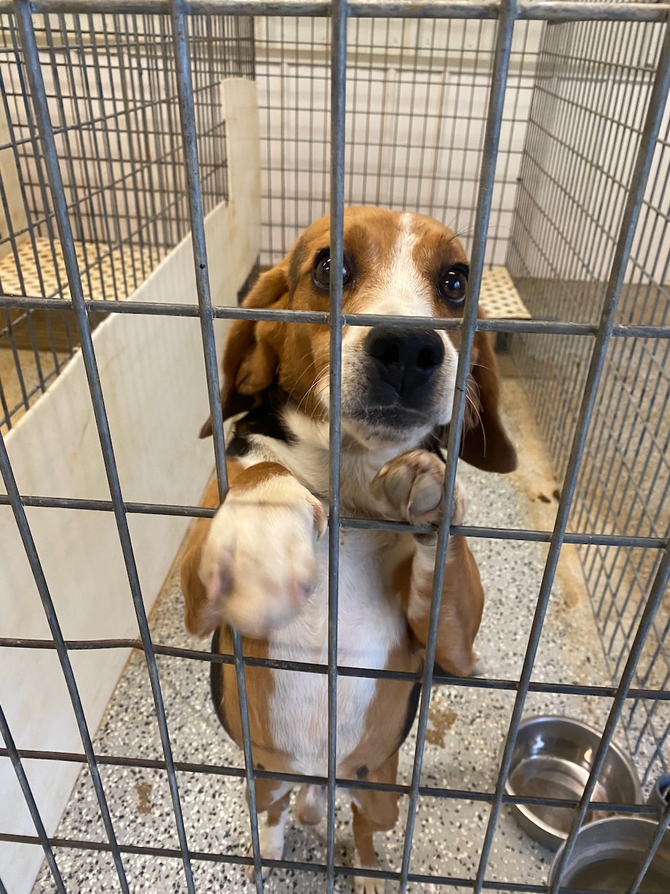 - Beagle held in a small metal cage begging for love at former animal testing lab shut down by Beagle Freedom Project