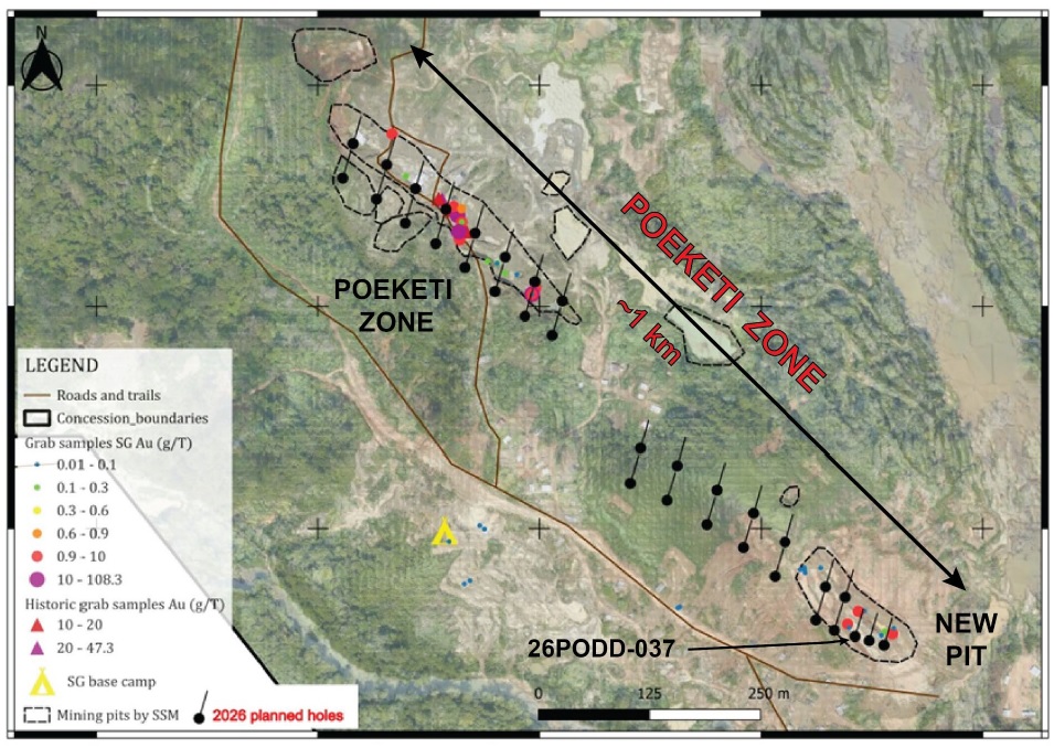 Figure 1. Initial Planned Poeketi Zone Drill Program (5,000 m). First hole 26PODD-037