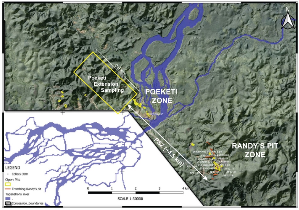 The Poeketi and Randy's Pit Zones, both hosting numerous artisanal pits and shallow underground mines extracting high-grade coarse gold, lie along the Poeketi Shear Zone ("PSZ"). Over the past months, artisanal miners have continued surface and underground mining along several pits in the Poeketi Zone. Drilling has commenced in the southeastern corner in an area referred to as the New Pit. These new workings establish a mineralized corridor for the Poeketi Zone of approximately 1 kilometre, which will be tested by the 5,000-metre drill program (see Figure 1).